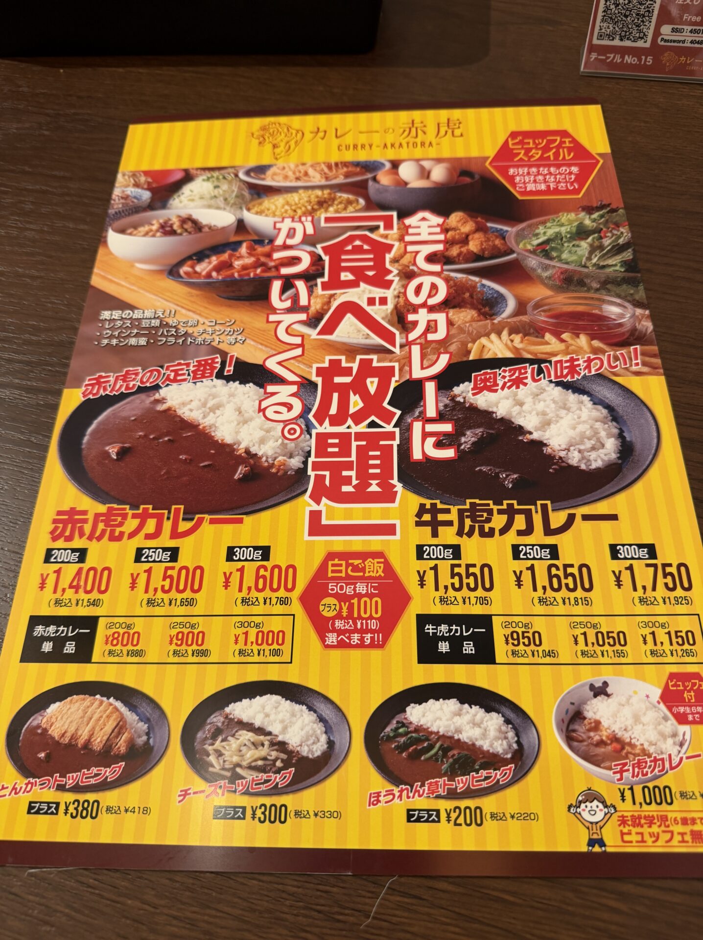 いたってシンプルなメニューで、赤虎カレーか牛虎カレーの2種類から選ぶことができ、ご飯は50g増えることに税込み110円プラスで増やせることができます。
