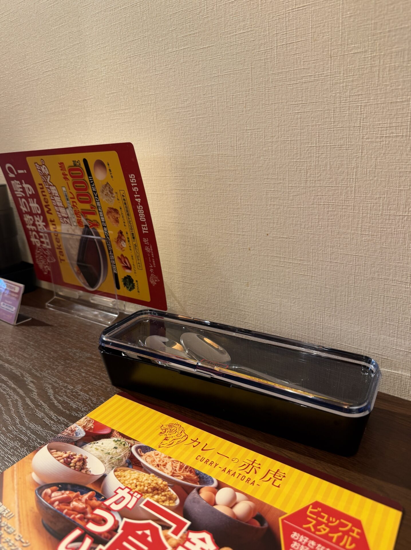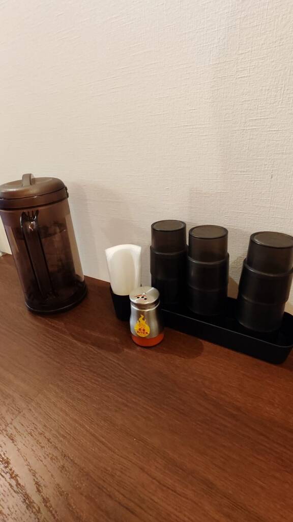 机の上には、スプーンや箸、お冷等があり、辛さが足りない時には机の上にあります「虎辛スパイス」をふりかけて食べてみてくださいね!